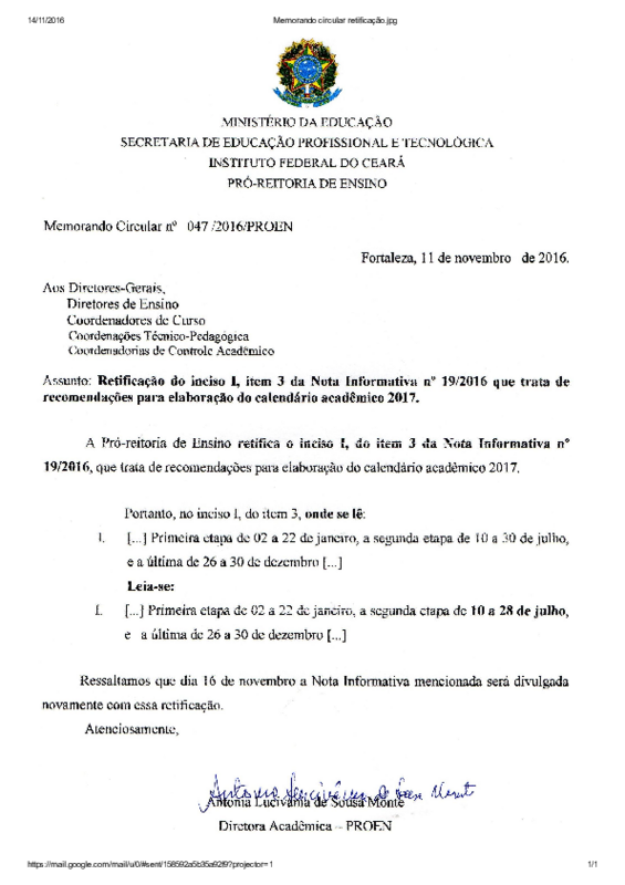 Retificação do inciso I, do item 3 da Nota Informativa n° 19/2016 que trata de recomendações para elaboração do calendário acadêmico 2017.
