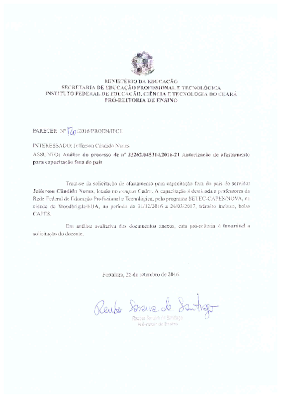 Processo 23262.045314.2016-21- autorização para afastamento do País para capacitação do servidor Jefferson Cândido Nunes - Campus Cedro.