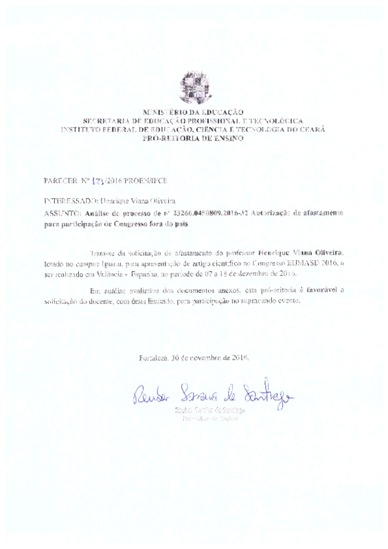 Análise do Processo 23266.045080.2016-32 - autorização para participação em Congresso fora do país do Professor Henrique Viana Oliveira - Campus Iguatu.