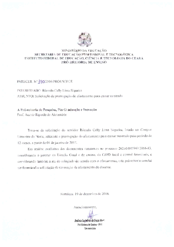 Solicitação de prorrogação de afastamento para cursar mestrado do servidor Rômulo Celly Lima Siquiera - Campus Limoeiro do Norte.