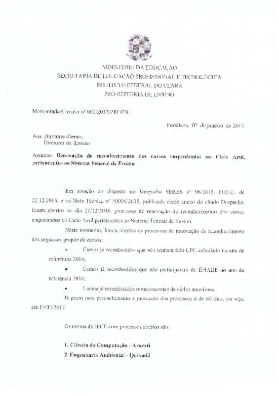 Renovação de reconhecimento dos cursos enquadrados no Ciclo Azul, pertencentes ao Sistema Federal de Ensino.