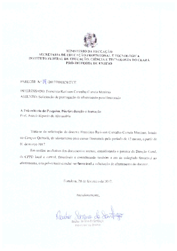 Solicitação de prorrogação de afastamento para Doutorado do docente Francisco Rerisson Carvalho Correia Máximo - Campus Quixadá.