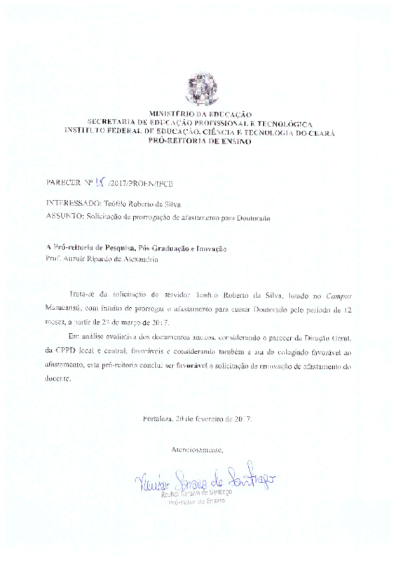 Solicitação de prorrogação de afastamento para Doutorado do servidor Teófilo Roberto da Silva - Campus Maracanaú.