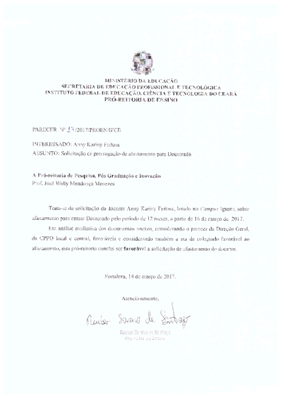 Solicitação de prorrogação de afastamento para Doutorado da Docente Anny Kariny Feitosa - Campus Iguatu.