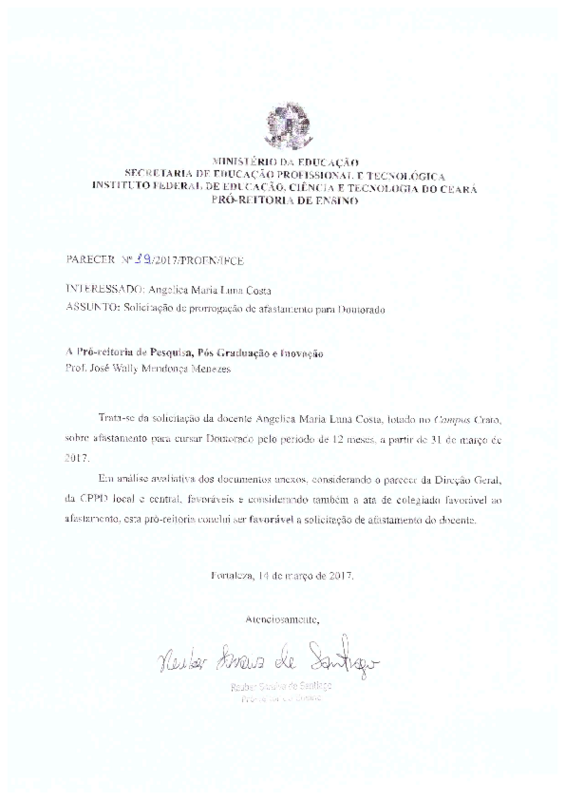 Solicitação de prorrogação de afastamento para Doutorado da Docente Angélica Maria Luna Costa - Campus Crato.