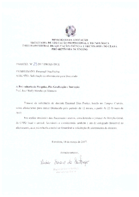 Solicitação de afastamento para Doutorado do docente Emanuel Dias Freitas - Campus Crateús.