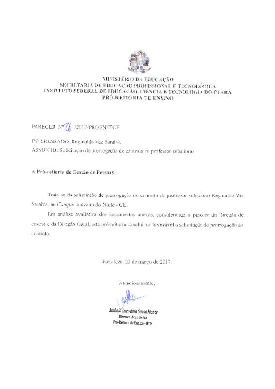 Solicitação de prorrogação de contrato de Professor Substituto Reginaldo Vaz Saraiva - Campus Juazeiro do Norte.