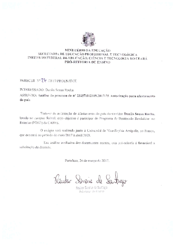 Análise do Processo 23257.012119.2017-75 - autorização para afastamento do país do servidor Danilo Sousa Rocha - Campus Sobral.