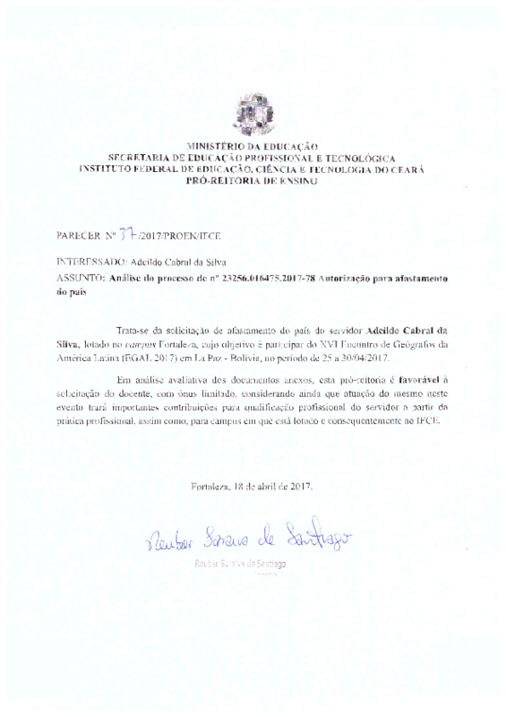 Análise do processo 23256.016475.2017-78 - autorização para afastamento do país do servidor Adeildo Cabral da Silva - Campus Fortaleza.