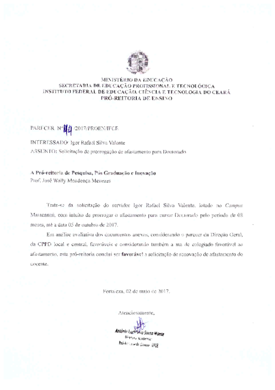 Solicitação de prorrogação de afastamento para Doutorado do servidor Igor Rafael Silva Valente - Campus Maracanaú.