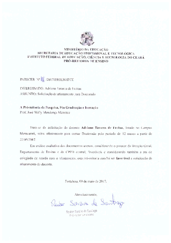 Solicitação de afastamento para Doutorado do docente Adriano Tavares de Freitas - Campus Maracanaú.