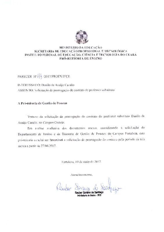 Solicitação de prorrogação de contrato do professor substituto Danilo de Araújo Camilo - Campus Crateús.