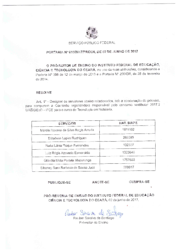 Art. 1º - Designar os servidores abaixo relacionados, sob a coodenação do primeiro, para comporem a Comissão organizadora responsável pelo concurso vestibular 2017.2 UAB/DEaD - IFCE para o curso de Tecnologia em Hotelaria.