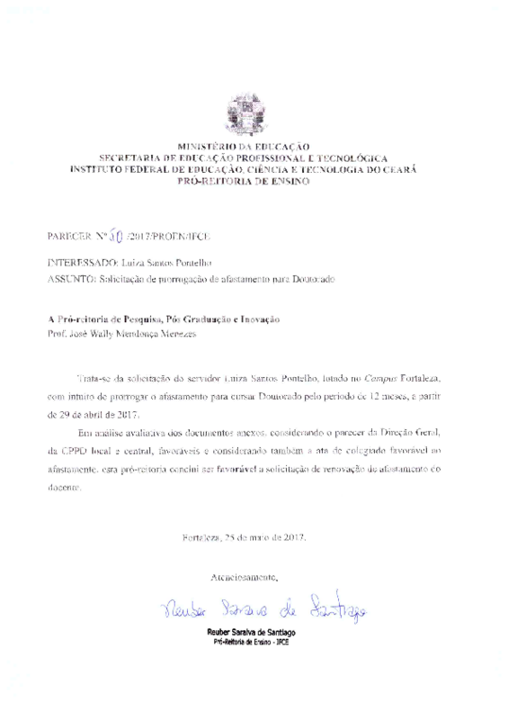 Solicitação de afastamento para doutorado de Luiza Santos Pontello - Campus Fortaleza.