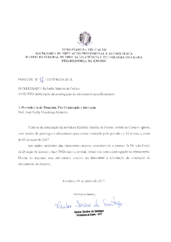 Solicitação de prorrogação de afastamento para doutorado da servidora Rafaella Martins de Freitas - Campus Iguatu.