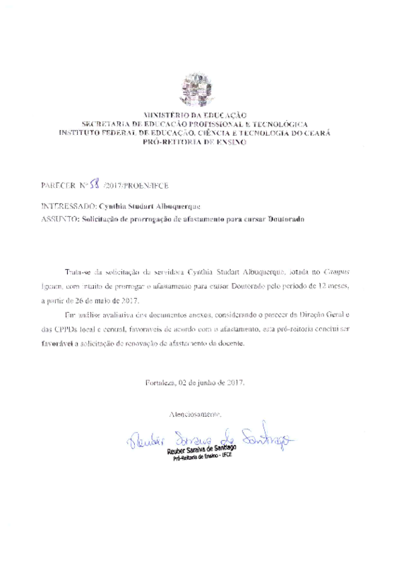 Solicitação de prorrogação de afastamento para doutorado da servidora Cynthia Studart Albuquerque - Campus Iguatu.