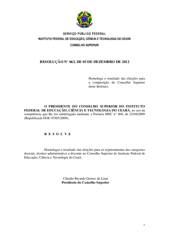 AbertaResolução N° 63/CONSUP/IFCE, DE 05 de dez de 2012