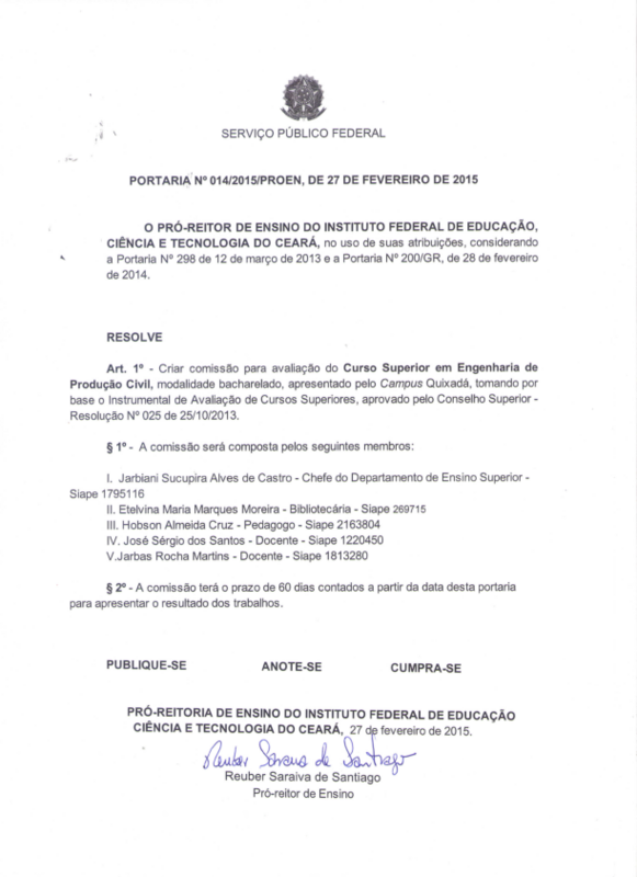 Art. 1º - Criar comissão para avaliação do Curso Superior em Engenharia de Produção Civil, modalidade bacharelado, apresentado pelo Campus Quixadá, tomando por base o Instrumental de Avaliação de Cursos Superiores, aprovado pelo Conselho Superior - Resolução Nº 025 de 25/10/2013.