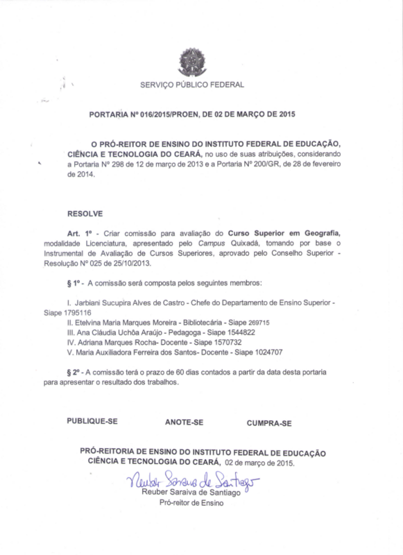 Art. 1º - Criar comissão para avaliação do Curso Superior em Geografia, modalidade Licenciatura, apresentado pelo Campus Quixadá, tomando por base o Instrumental de Avaliação de Cursos Superiores, aprovado pelo Conselho Superior - Resolução Nº 025 de 25/10/2013.