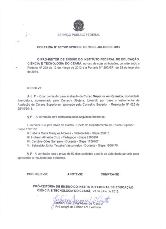 Art. 1º - Criar comissão para avaliação do Curso Superior em Química, modalidade licenciatura, apresentado pelo Campus Ubajara, tomando por base o Instrumental de Avaliação de Cursos Superiores, aprovado pelo Conselho Superior - Resolução Nº 025 de 25/10/2013.