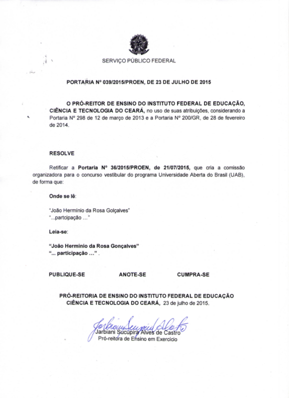 - Título alterado de Portaria No. 39/2014/PROEN, de 23 de Julho de 2015 para Portaria No. 39/2015/PROEN, de 23 de Julho de 2015