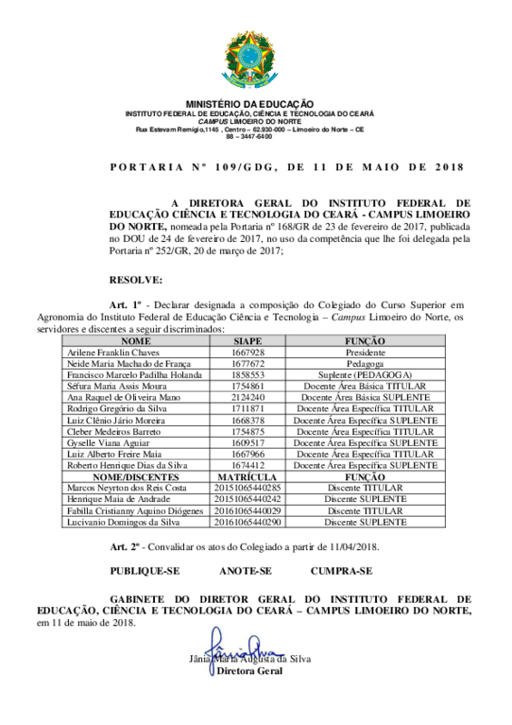 Art. 1º - Declarar designada a composição do Colegiado do Curso Superior em Agronomia do Instituto Federal de Educação Ciência e Tecnologia – Campus Limoeiro do Norte, os servidores e discentes a seguir discriminados: