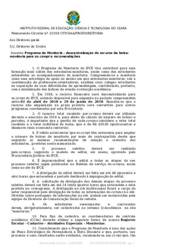 Programa de Monitoria - descentralização do recurso de bolsa monitoria