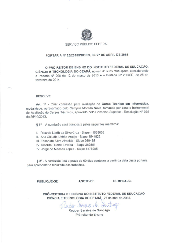 Art. 1º - Criar comissão para avaliação do Curso Técnico em Informática, modalidade concomitante, apresentado pelo Campus Morada Nova, tomando por base o Instrumental de Avaliação de Cursos Técnicos, aprovado pelo Conselho Superior - Resolução Nº 025 de 25/10/2013.