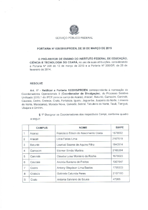 Art. 1º - Retificar a Portaria 12/2015/PROEN correspondente à nomeação do Coordenadores Operacionais II (Coordenador de Divulgação), do Processo Seletivo Unificado 2015.1 do IFCE para os campi de Acaraú, Aracatí, Baturité, Camocim, Canindé, Caucaia, Cedro, Crateús, Crato, Fortaleza, Iguatu, Jaguaribe, Juazeiro do Norte, Limoeiro do Norte, Maracanaú, Morada Nova, Quixadá, Sobral, Tabuleiro do Norte, Tauá, Tianguá, Ubajara e Umirim.