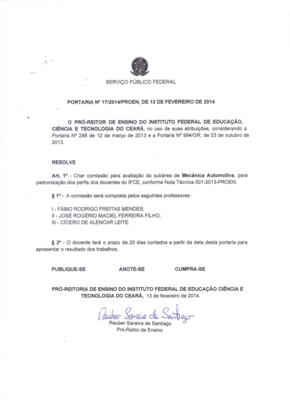 Art. 1º - Criar comissão para avaliação da subárea de Mecânica Automotiva, para padronização dos perfis dos docentes do IFCE, conforme Nota Técnica 001-2013-PROEN.