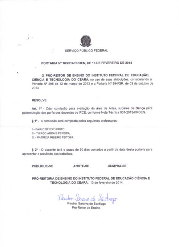Art. 1º - Criar comissão para avaliação da área de Artes, subárea de Dança para padronização dos perfis dos docentes do IFCE, conforme Nota Técnica 001-2013-PROEN.