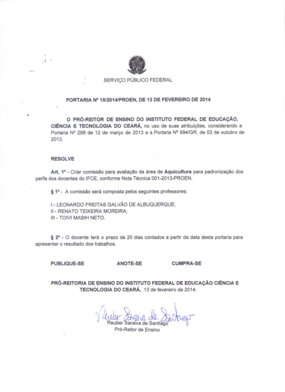 Art. 1º - Criar comissão para avaliação da área de Aquicultura para padronização dos perfis dos docentes do IFCE, conforme Nota Técnica 001-2013-PROEN.