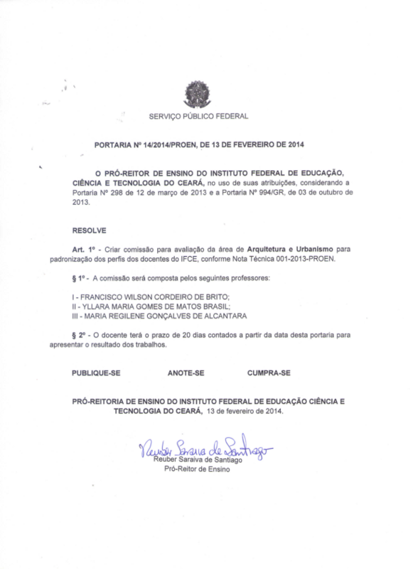 Art. 1º - Criar comissão para avaliação da área de Arquitetura e Urbanismo para padronização dos perfis dos docentes do IFCE, conforme Nota Técnica 001-2013-PROEN.