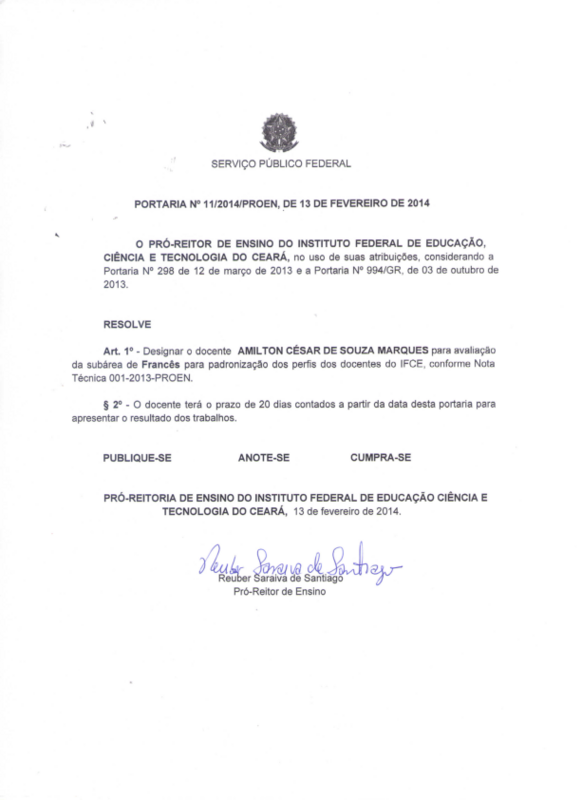 Art. 1º - Designar o docente AMILTON CÉSAR DE SOUZA MARQUES para avaliação da subárea de Francês para padronização dos perfis dos docentes do IFCE, conforme Nota Técnica 001-2013-PROEN.