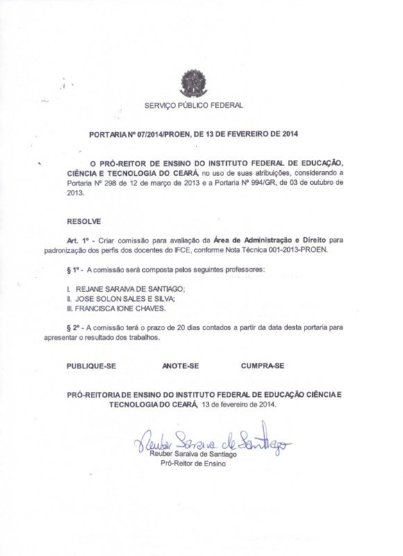 Art. 1º - Criar comissão para avaliação da Área de Administração e Direito para padronização dos perfis dos docentes do IFCE, conforme Nota Técnica 001-2013-PROEN.