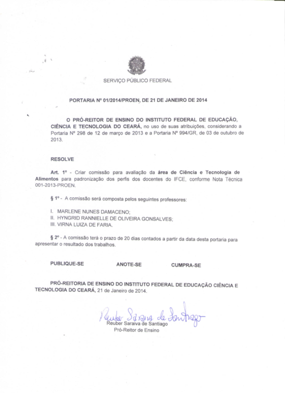 Art. 1º - Criar comissão para avaliação da área de Ciência e Tecnologia de Alimentos para padronização dos perfis dos docentes do IFCE, conforme Nota Técnica 001-2013-PROEN.