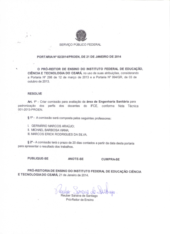 Art. 1º - Criar comissão para avaliação da área de Engenharia Sanitária para padronização dos perfis dos docentes do IFCE, conforme Nota Técnica 001-2013-PROEN.