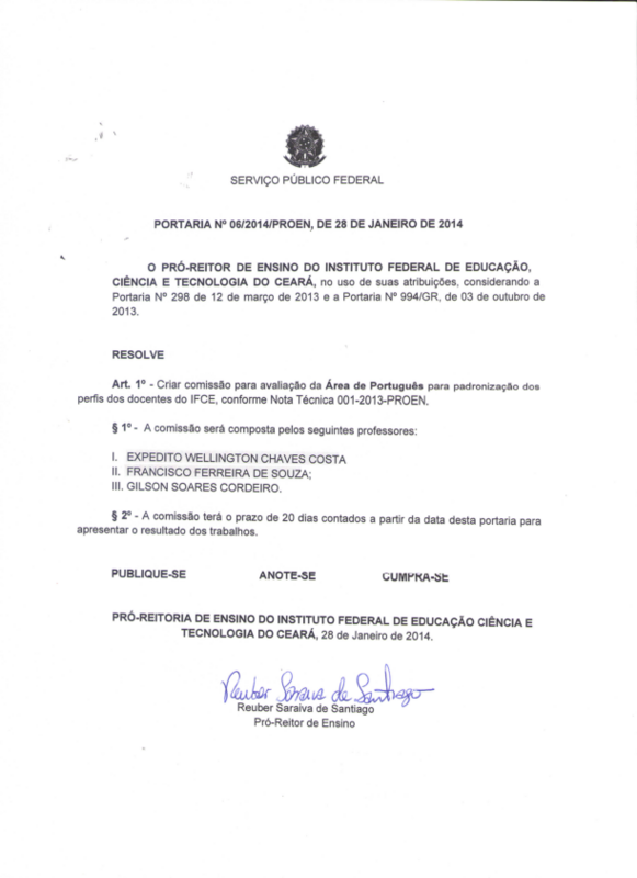 Art. 1º - Criar comissão para avaliação da Área de Português para padronização dos perfis dos docentes do IFCE, conforme Nota Técnica 001-2013-PROEN.