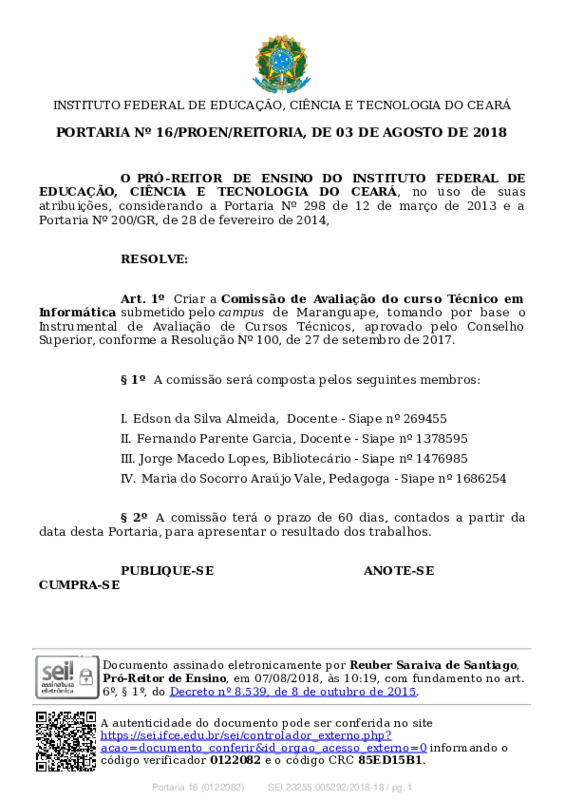 AbertaPORTARIA Nº 16/PROEN/REITORIA, DE 03 DE AGOSTO DE 2018