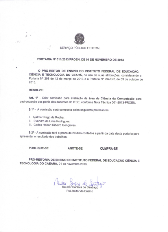 Art. 1º - Criar comissão para avaliação da área de Ciência da Computação para padronização dos perfis dos docentes do IFCE, conforme Nota Técnica 001-2013-PROEN.