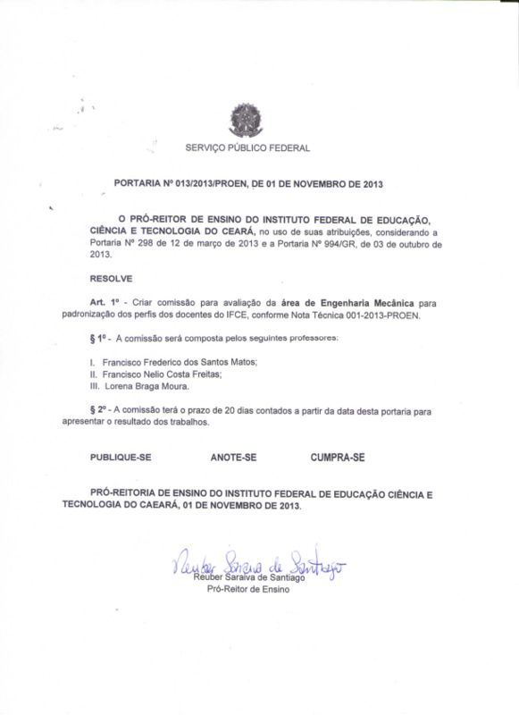 Art. 1º - Criar comissão para avaliação da área de Engenharia Mecânica para padronização dos perfis dos docentes do IFCE, conforme Nota Técnica 001-2013-PROEN.