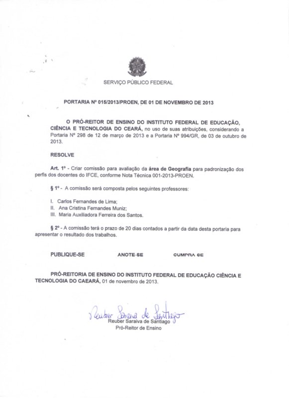 Art. 1º - Criar comissão para avaliação da área de Geografia para padronização dos perfis dos docentes do IFCE, conforme Nota Técnica 001-2013-PROEN.