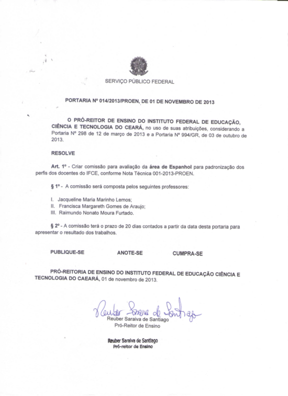 Art. 1º - Criar comissão para avaliação da área de Espanhol para padronização dos perfis dos docentes do IFCE, conforme Nota Técnica 001-2013-PROEN.