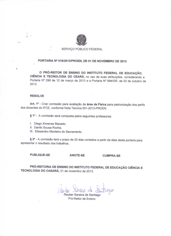 Art. 1º - Criar comissão para avaliação da área de Física para padronização dos perfis dos docentes do IFCE, conforme Nota Técnica 001-2013-PROEN.