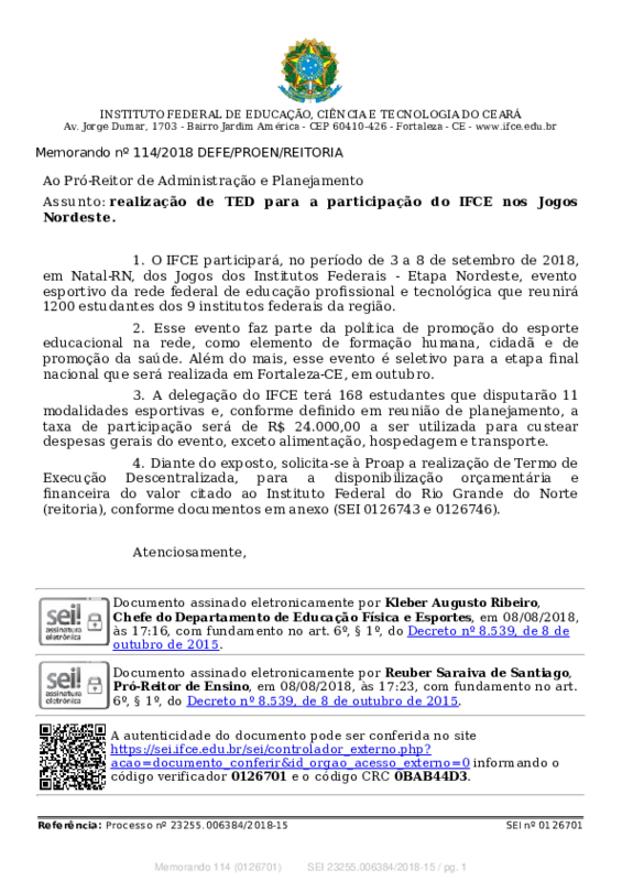 AbertaMemorando nº 114/2018 DEFE/PROEN/REITORIA