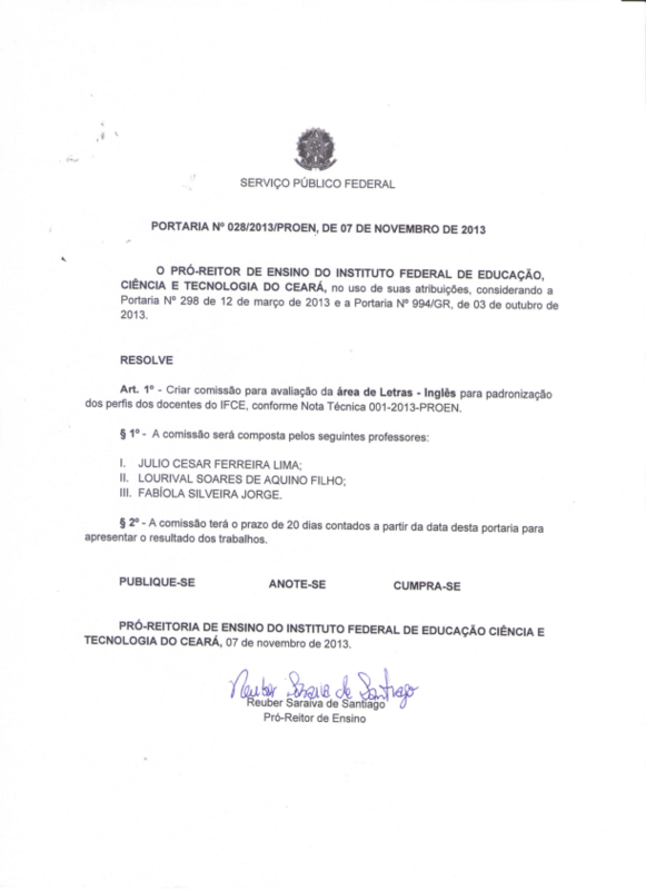 Art. 1º - Criar comissão para avaliação da área de Letras - Inglês para padronização dos perfis dos docentes do IFCE, conforme Nota Técnica 001-2013-PROEN.