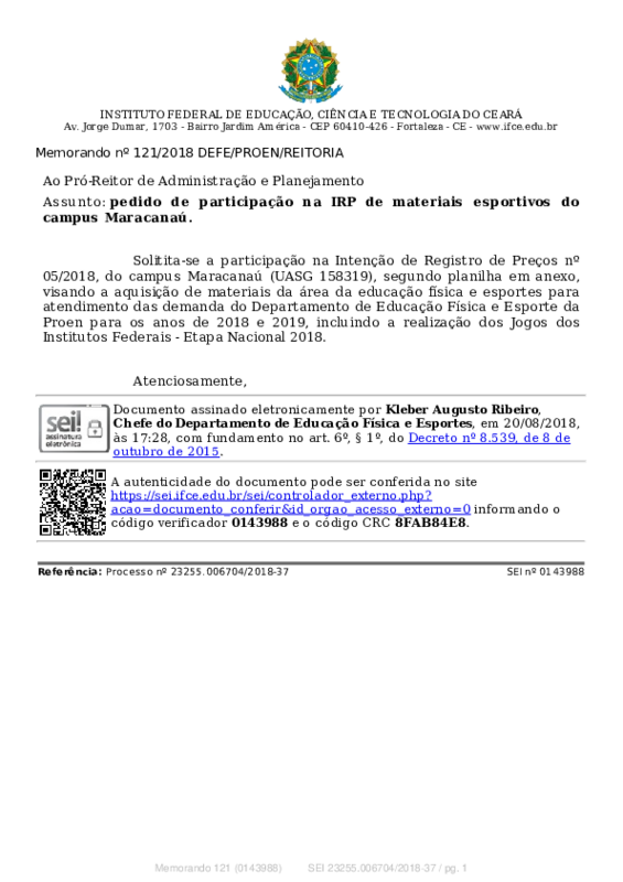 AbertaMemorando nº 121/2018 DEFE/PROEN/REITORIA