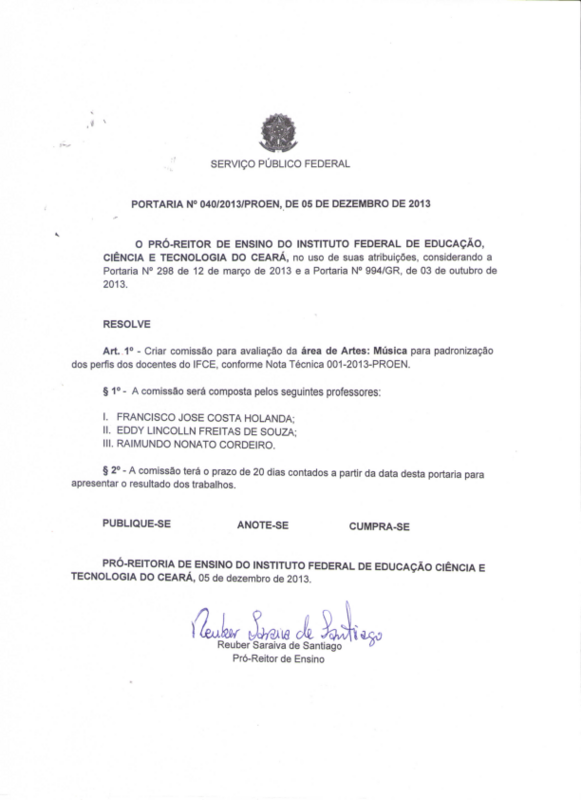 Art. 1º - Criar comissão para avaliação da área de Artes: Música para padronização dos perfis dos docentes do IFCE, conforme Nota Técnica 001-2013-PROEN.