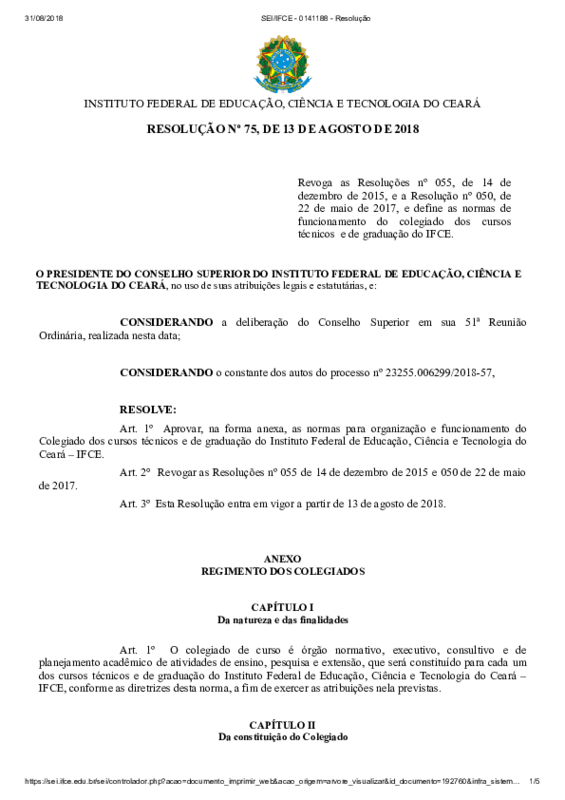 Revoga as Resoluções nº 055, de 14 de dezembro de 2015, e a Resolução nº 050, de 22 de maio de 2017, e define as normas de funcionamento do colegiado dos cursos técnicos e de graduação do IFCE.