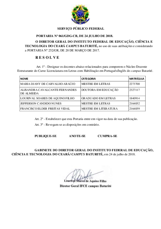 AbertaNúcleo Docente Estruturante do Curso Licenciatura em Letras com Habilitação em Português/Inglês do campus Baturité
